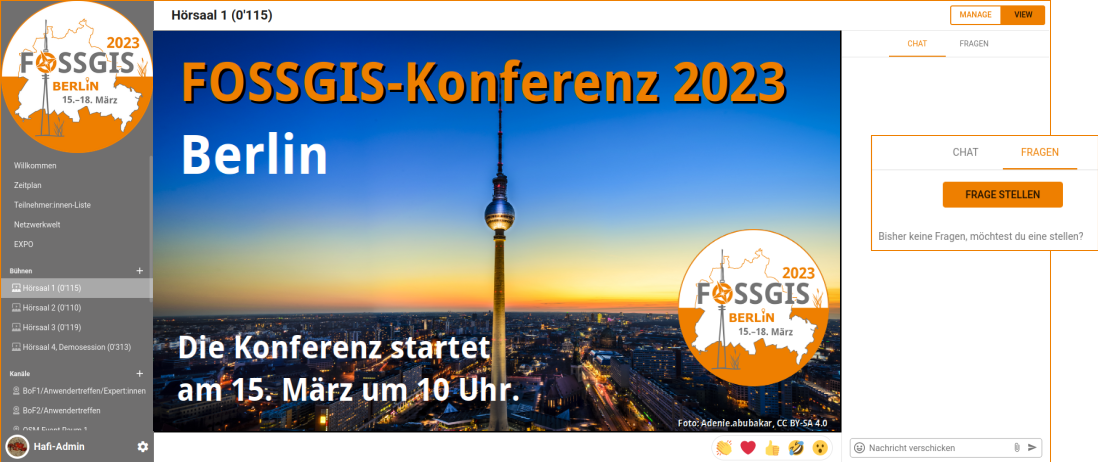 Für die Konferenz wird die Online-Plattform Venueless verwendet, Vorträge und Demosessions werden per Livestream auf vier Bühnen ausgestrahlt.