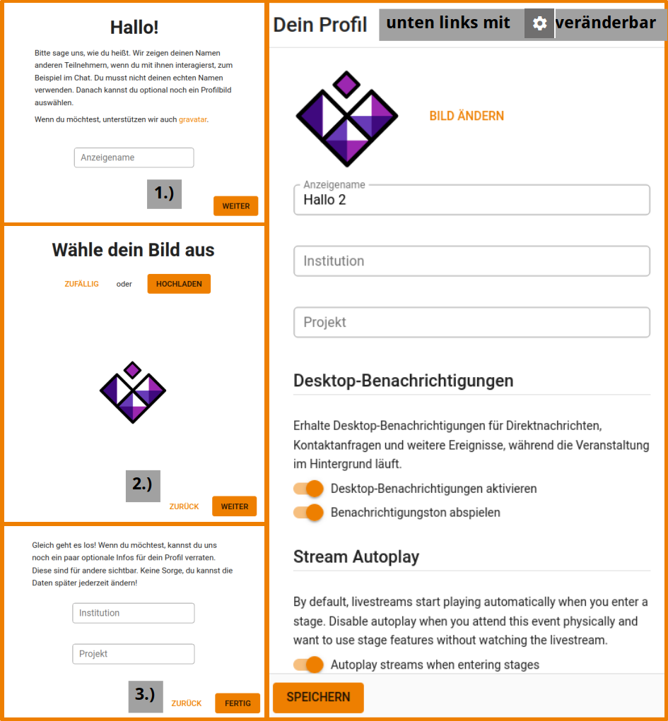 Geben Sie Ihren Vor- und Nachnamen ein, dieser wird zur Interaktion mit anderen Teilnehmenden verwendet. Laden Sie gern ein Foto hoch, dieses ist für alle Teilnehmenden sichtbar. Es ist in Ordnung, kein Foto zu verwenden, wenn Sie Ihre Privatsphäre wahren möchten.