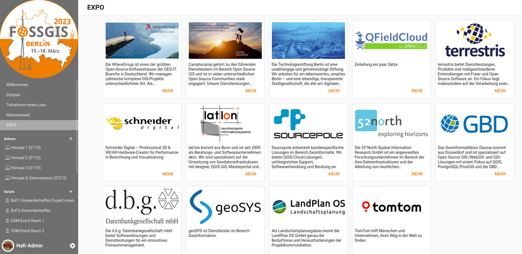 Willkommensseite, Zeitplan, Netzwerkwelt, Expo, Teilnehmer:innen-Liste.