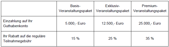 - Attraktive Rabatte auf die reguläre Teilnahmegebühr im Rahmen Ihres individuellen Veranstaltungspakets