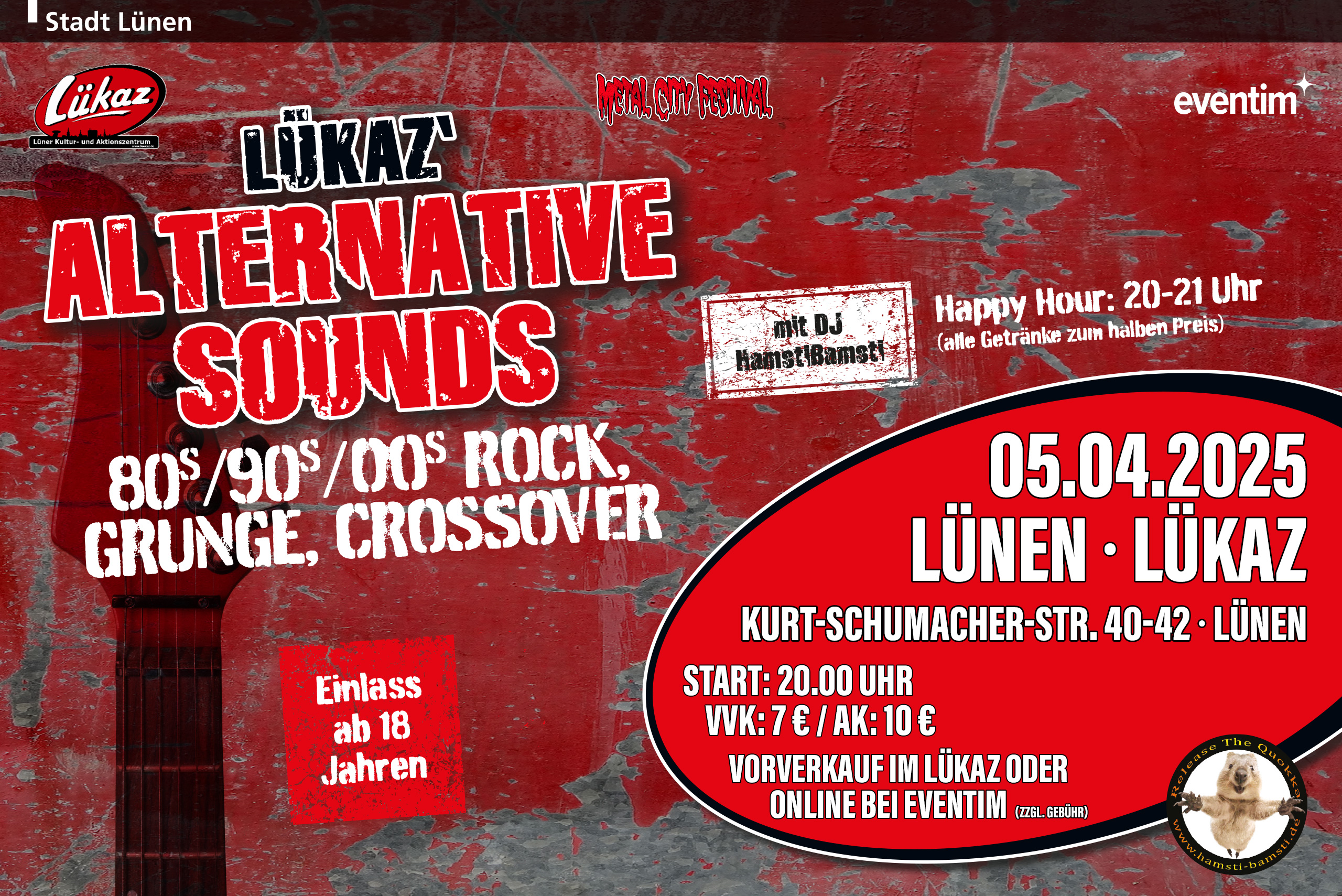 Wir starten in die nächste Runde. Am 06.12.25 wird es wieder „rotzig“ im Lükaz. Wir lassen erneut die 80er, 90er, 00er Jahre des Grunge und Alternative Rock aufleben. Von „Seattles finest“ über Alternative Classics bis hin zu Crossover hat DJ HamstiBamsti aus Dortmund (z. B. Rock It!-Party) alles auf dem sprichwörtlichen Plattenteller was euren „Teen Spirit“ wieder zum Leben erweckt.