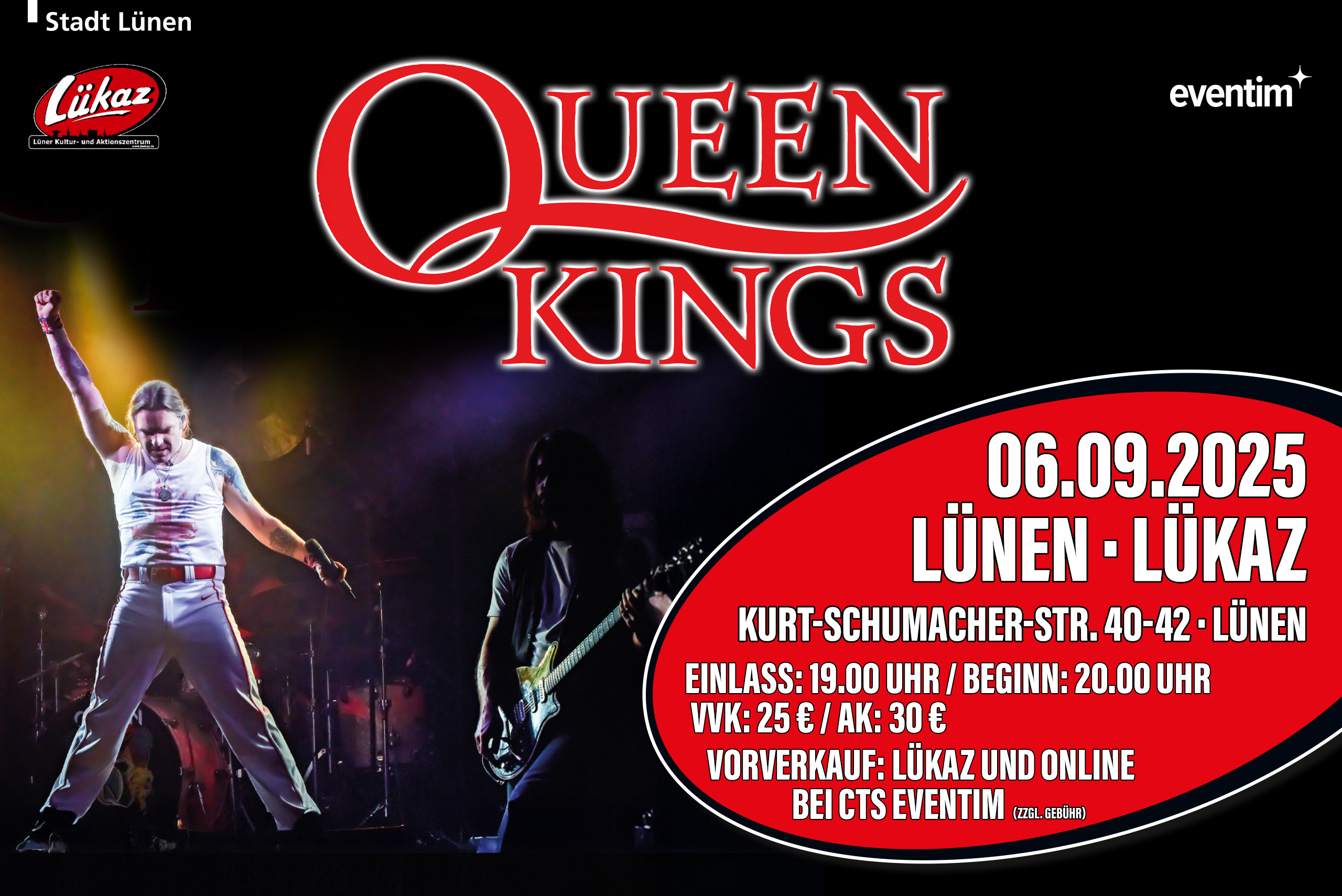 THE QUEEN KINGS entführen in die Welt von Freddie Mercury und Queen und bieten eine mitreißende Show mit den schönsten Songs der legendären englischen Supergroup! Für ihre Show haben sich die Musiker von THE QUEEN KINGS vom Film „Bohemian Rhapsody“ inspirieren lassen und bringen neben den größten Hits auch das legendäre Set auf die Bühne, mit dem Queen beim Live-Aid Konzert zehntausende Zuschauer im Londoner Wembley Stadion, sowie Millionen Zuschauer der weltweiten Übertragung begeisterten. Freuen Sie sich auch auf sämtliche weitere im Film vertretenen Titel, zu 100% live gespielt von den THE QUEEN KINGS-Musikern.