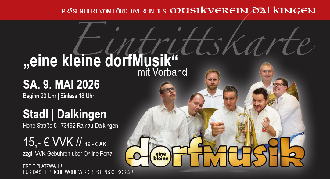 Blasmusikabend mit stimmungsmachender Vorband, leckeren Speisen und Getränken sowie der kleinen Dorfmusik als Hauptact.