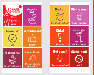 Die 12 Karten decken die wichtigsten Aussagen ab wie Ja! Nein! Danke! Super! Du bist stummgeschaltet! usw. Jede Karte enthält die Aussage in österreichischem Dialekt + als Grafik + Hochdeutsch.