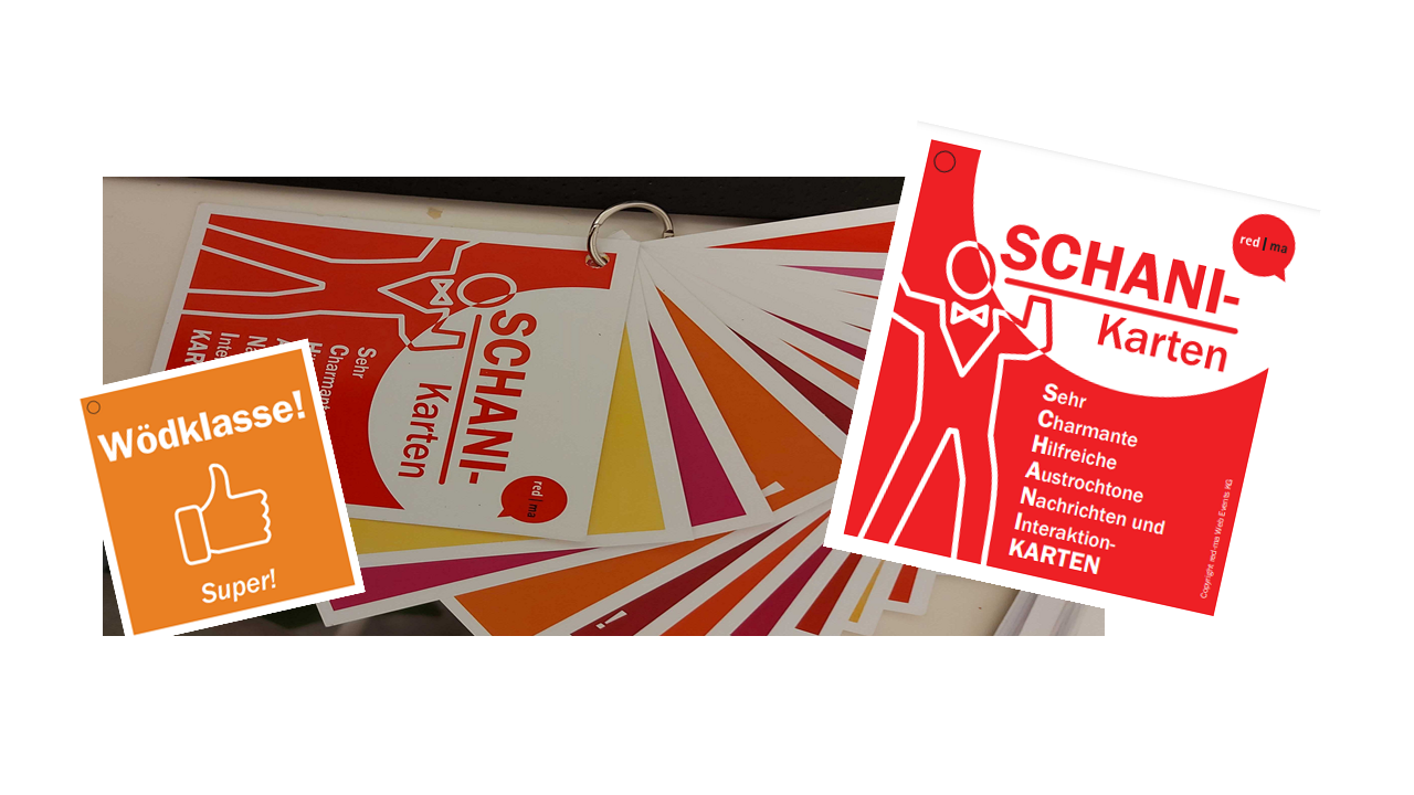 Oft ist es sowohl für die Moderation oder Vortragende als auch für Teilnehmende bei Webinaren oder Online-Konferenzen schneller, eine Karte in die Kamera zu zeigen als per Audio zu antworten. Mit den SCHANI-Karten gelingt das einfach und mit Schmäh ;-)