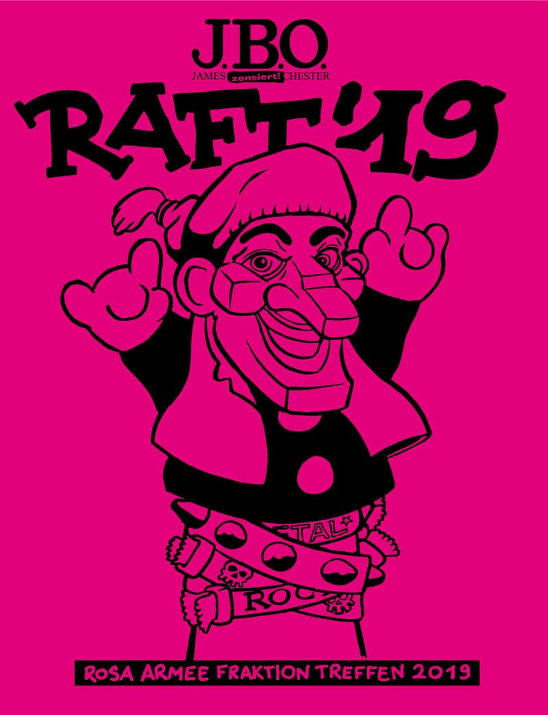 Das Rosa Armee Fraktion Treffen ist das jährliche Treffen der J.B.O.-Fans mit der Band. Mit Gelegenheit für ausführliche Gespräche und Fotos mit der Band, aber es gibt natürlich auch Merch zu Sonderpreisen und viel Zeit, sich alles signieren zu lassen. Wie immer in Erlangen und wie immer mit einem exklusiven T-Shirt!