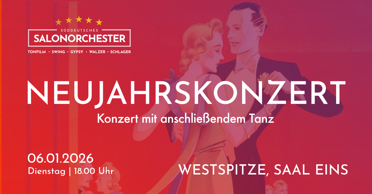 Am 6. Januar 2026 lädt das Süddeutsche Salonorchester zu einem festlichen Neujahrskonzert mit Sektempfang in die Westspitze Tübingen ein. Freuen Sie sich auf einen Abend mit schwungvoller Swing- und Filmmusik, eleganten Walzern und virtuosen Preziosen aus der Schatzkammer der Salonmusik der 20er bis 40er Jahre.